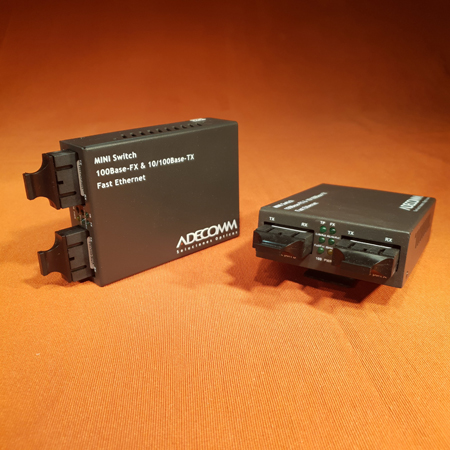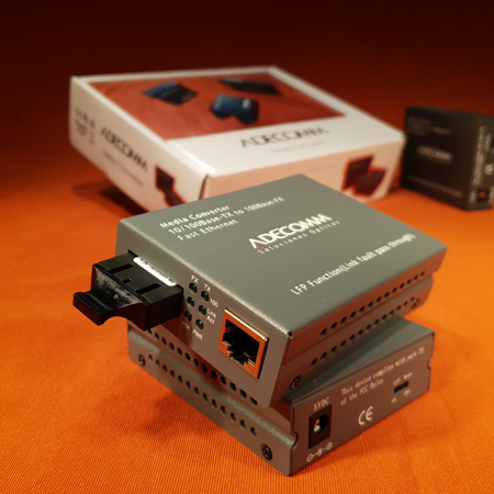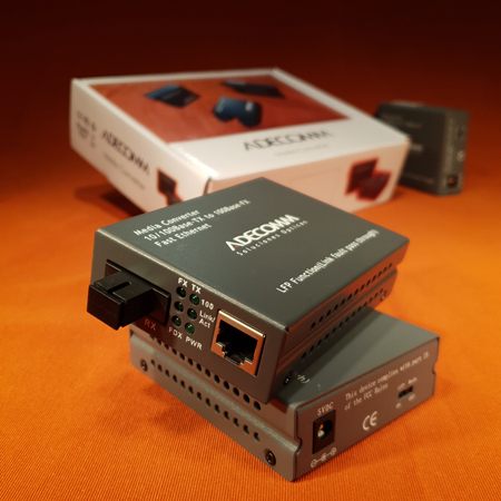 10/100/t to 100 fx adecomm media converter, single mode stand alone 20km (far end control included)