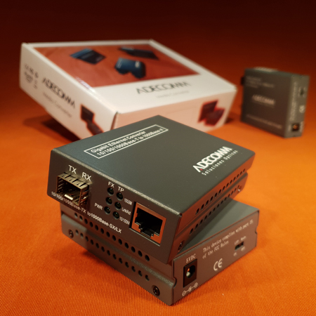 10/100/1000/t to 1000(lx/sx) adecomm media converter, stand alone, ready to sfp gigabite transceiver lc connector.