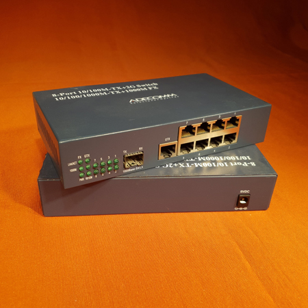 Mini switch (4x100fx mm) +4 tp port based port v-lan (802.1q),, 4 multimode ports up to 2 km.