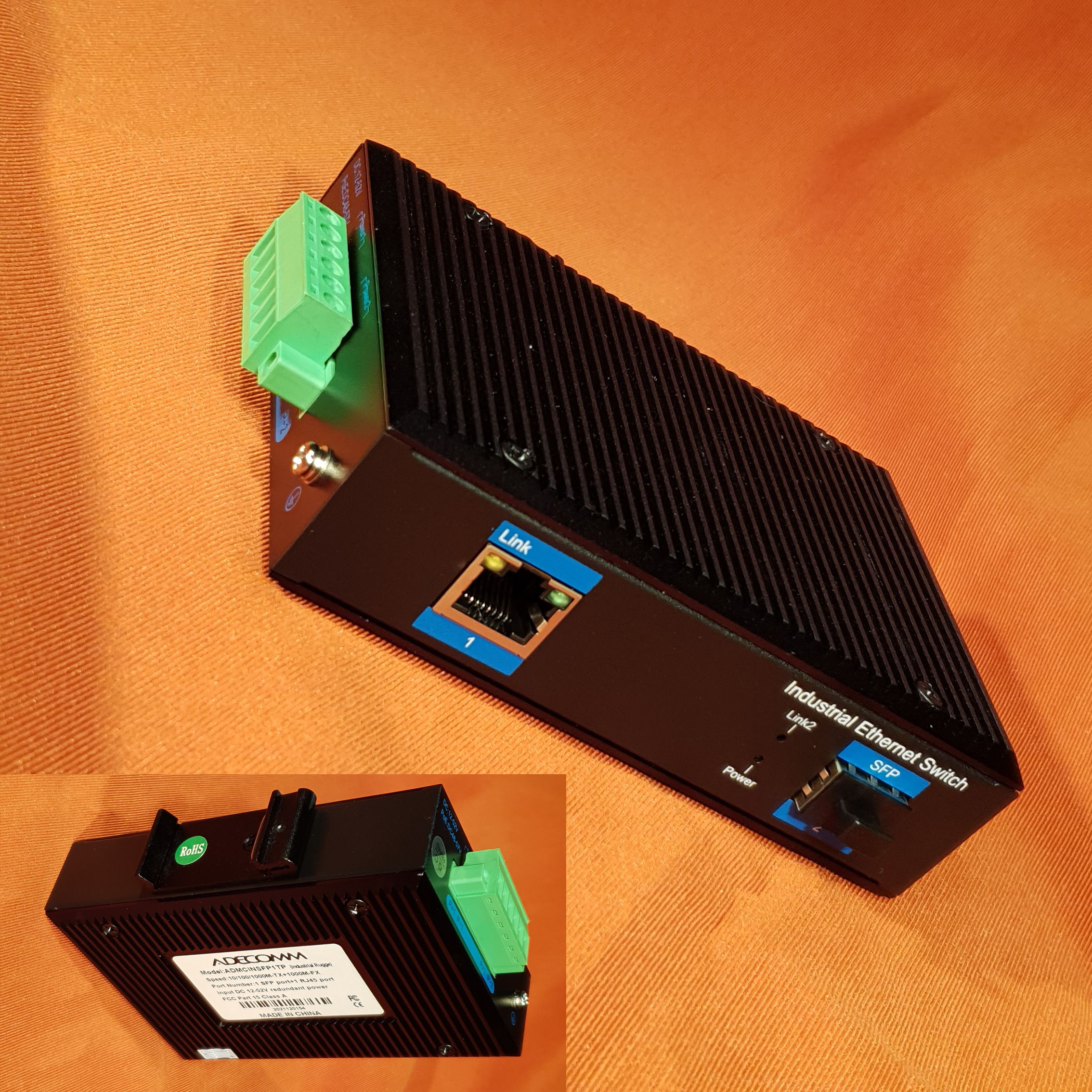 10/100/t to 1000fx adecomm media converter industrial series, ready to sfp gigabite transceiver lc connector, din rail mount, 10 – 52vdc dual power input