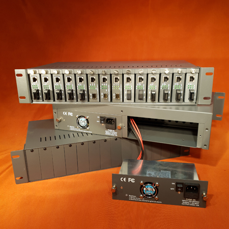 Stand alone mounting rack system, cuerpo de aluminio, color negro para 14 media converters o 14 miniswitchs, con fuente autoregulada autoregulable, entrada 80-260 vca., 14 salidas 5vcc x 500ma c/u