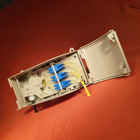 Ftth – 12 fibers distribution box (for indoor/outdoor use) – 270(h)x200(w)x80(d) – ip56 – ral7035 colour – uv protected – 2in – 12out – including all splice trays and coupler support
